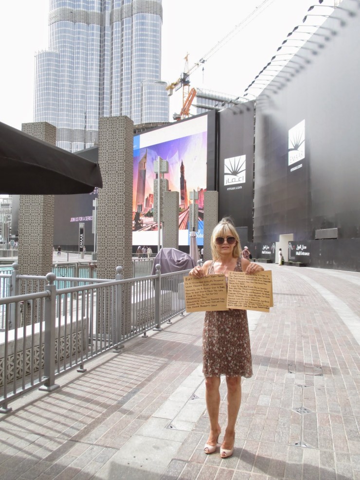 On the day before I returned to South Africa, I stood outside the Dubai Mall, the Burj Khalifa in the background, holding two makeshift placards, my solo, silent protest against the Government of Dubai, wearing one of Laura’s dresses with her Shiva Shakti pendant around my neck.