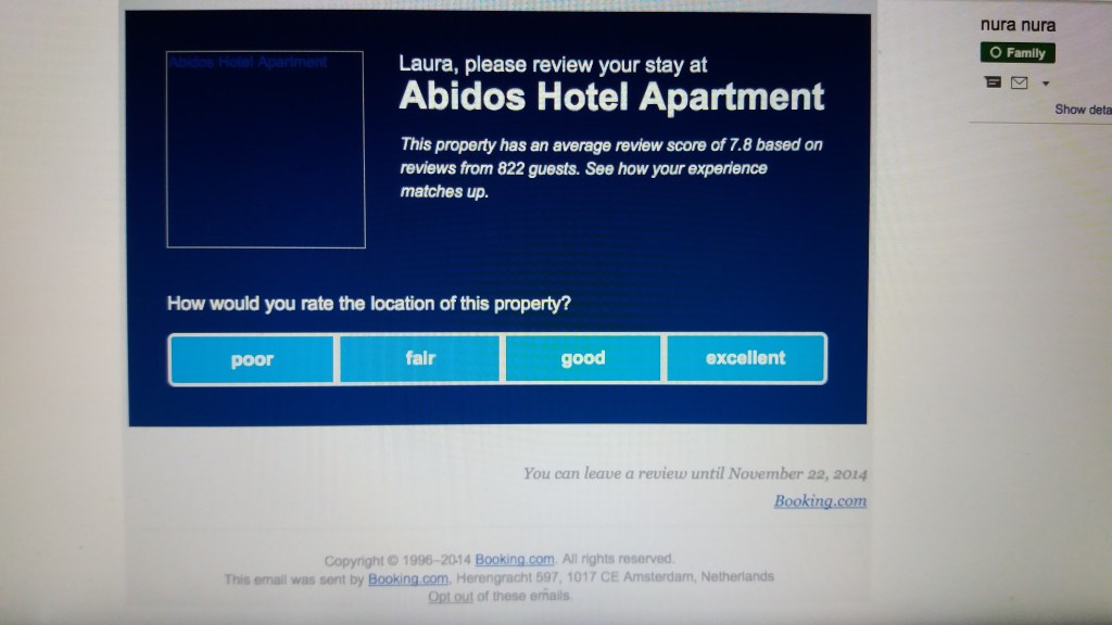 A few days later I posted the requested review of the Abidos Hotel Dubai from booking.com which had been sent to Laura, on my google + page, for her to rate her stay at the Abidos Hotel.