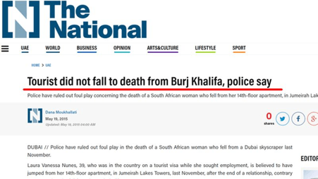 “On 16 November 2014, Laura Vanessa Nunes, a Portuguese national that entered Dubai on a tourist visa, fell to her death from the At the Top Sky observation deck on the 148th floor of the Burj Khalifa, Dubai.”