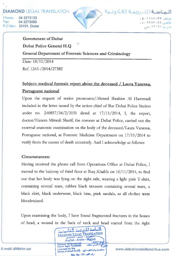 The first page of the medical forensic report issued by the Government of Dubai. So awful for a mother to have to make such a personal document public.