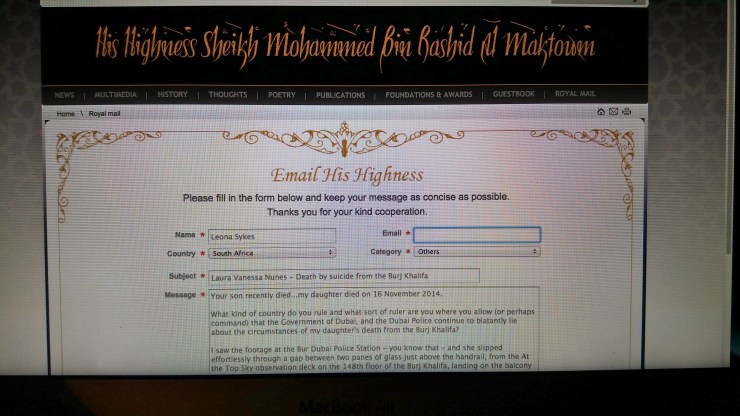 What kind of country do you rule and what sort of ruler are you where you allow (or perhaps command) that the Government of Dubai and the Dubai Police continue to blatantly lie about the circumstances of my daughter’s death from the Burj Khalifa?