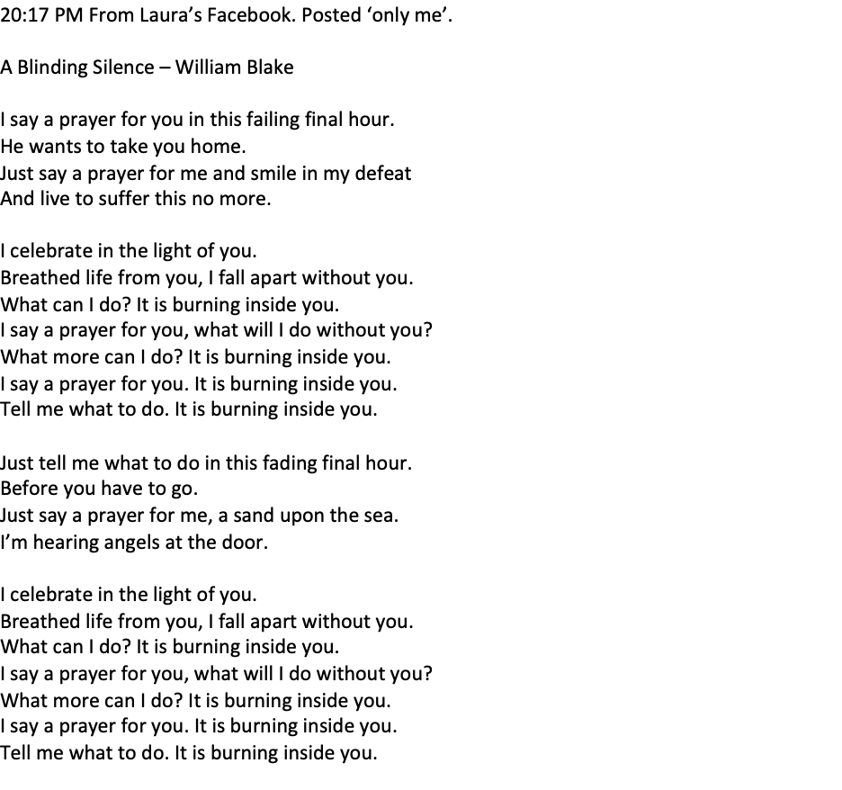 20:17 PM From Laura’s Facebook. Posted ‘only me’.