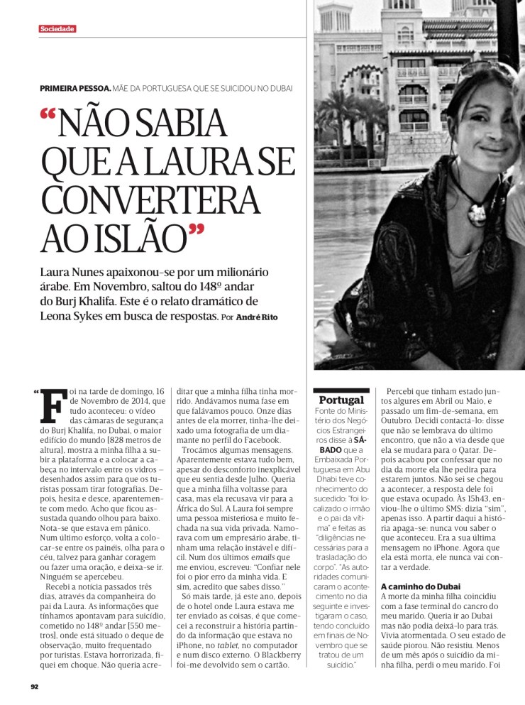 Leona Sykes has shared harrowing details on her Google+ account of how her daughter Laura Vanessa Nunes jumped from the 148th floor of the world’s tallest building, the Burj Khalifa, last November.
